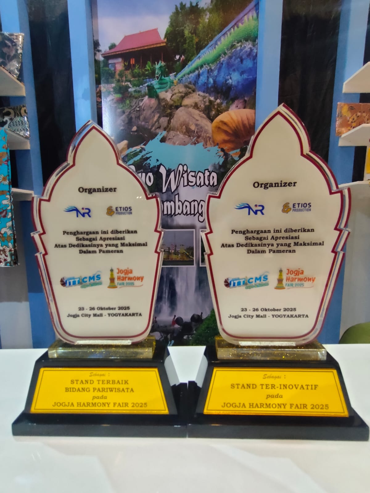 Event yang dilaksankan mulai 23 - 26 Oktober 2026 di Jogja City Mall ini, kami melakukan promosi terintegrasi yang meliputi bukan hanya pariwisata dan ekonomi kreatif namun juga ada investasi dan perdagangan. "Alhamdulillah, di event tersebut kami berhasil memperoleh dua penghargaan sekaligus. Pertama, sebagai stand terbaik di bidang pariwisata, kedua yakni stand terinovatif.