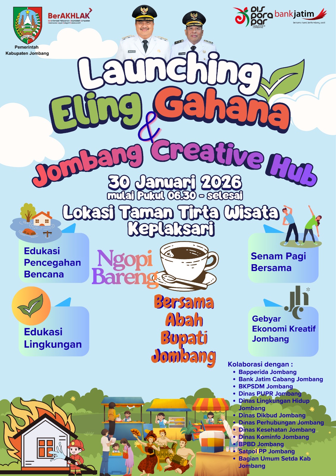 Jombang – Dukungan penuh Abah Bupati Jombang serta kolaborasi apik antar Organisasi Perangkat Daerah (OPD) di lingkup Pemerintah Kabupaten Jombang bersama Bank Jatim Cabang Jombang diwujudkan melalui kegiatan Launching Edukasi Lingkungan dan Pencegahan Bencana serta Jombang Creative Hub yang akan dilaksanakan di Tirta Wisata Jombang pada tanggal 30 Januari 2026, pukul 06.30 WIB.